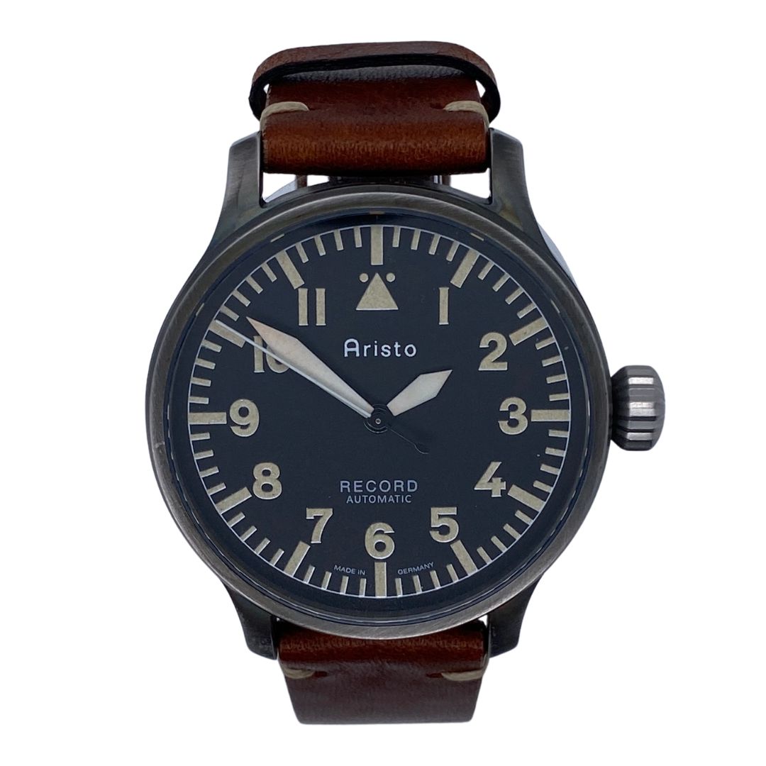 The Vintage 42 Observer Record Automatic belongs to Aristo’s Observer line, which pays tribute to the classic B‑Uhren watches used by Luftwaffe navigators during World War II. These oversized timepieces were designed for accuracy and legibility, often worn over thick flight jackets and used as essential instruments in aerial navigation. By integrating a Swiss Record automatic movement from the 1970s, Aristo bridges two eras: the wartime observer tradition and the mechanical watchmaking heritage of mid‑20th‑century Switzerland. The Vintage 42 continues this legacy while adding modern refinements such as sapphire glass and a transparent caseback, appealing to collectors who value both historical authenticity and the charm of vintage calibers. It embodies Aristo’s philosophy of preserving aviation design cues while celebrating the mechanical artistry of past decades.