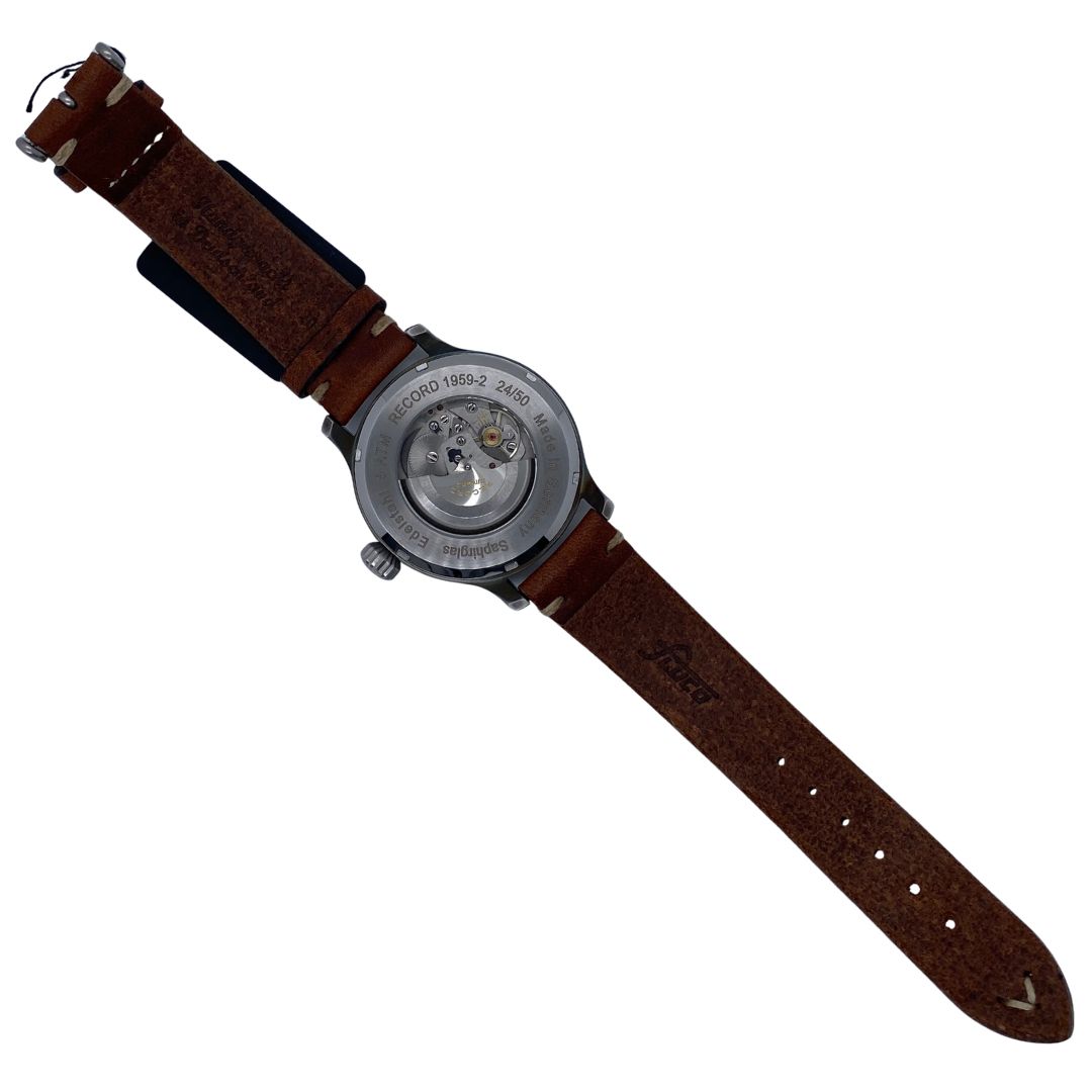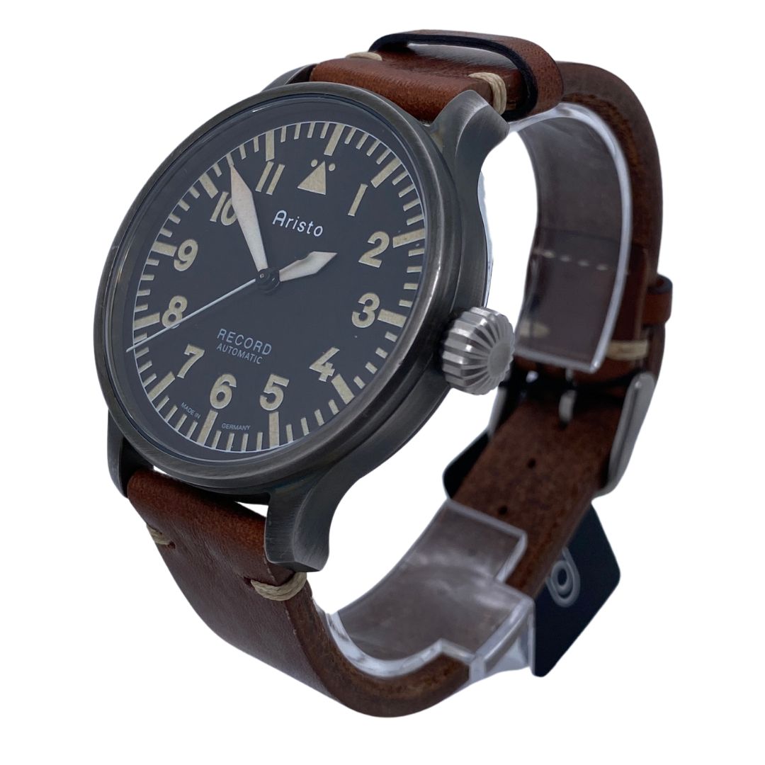 The Aristo Vintage 42 Observer Record Automatic is a German pilot’s watch from the brand’s Record line. It features a 42 mm stainless steel case, housing a rare Swiss Record 1959‑2 automatic movement from the 1970s, with 17 jewels, 21,600 A/h, and a 40‑hour power reserve. A sapphire crystal ensures durability, while the exhibition caseback reveals the historic caliber. The dial follows the traditional Baumuster A/B observer style, with luminous numerals and hands for optimal legibility. A large crown allows easy adjustment, and the watch is water‑resistant to 5 ATM. It comes on a hand‑stitched vintage leather strap with beige stitching, reinforcing its aviation heritage aesthetic.