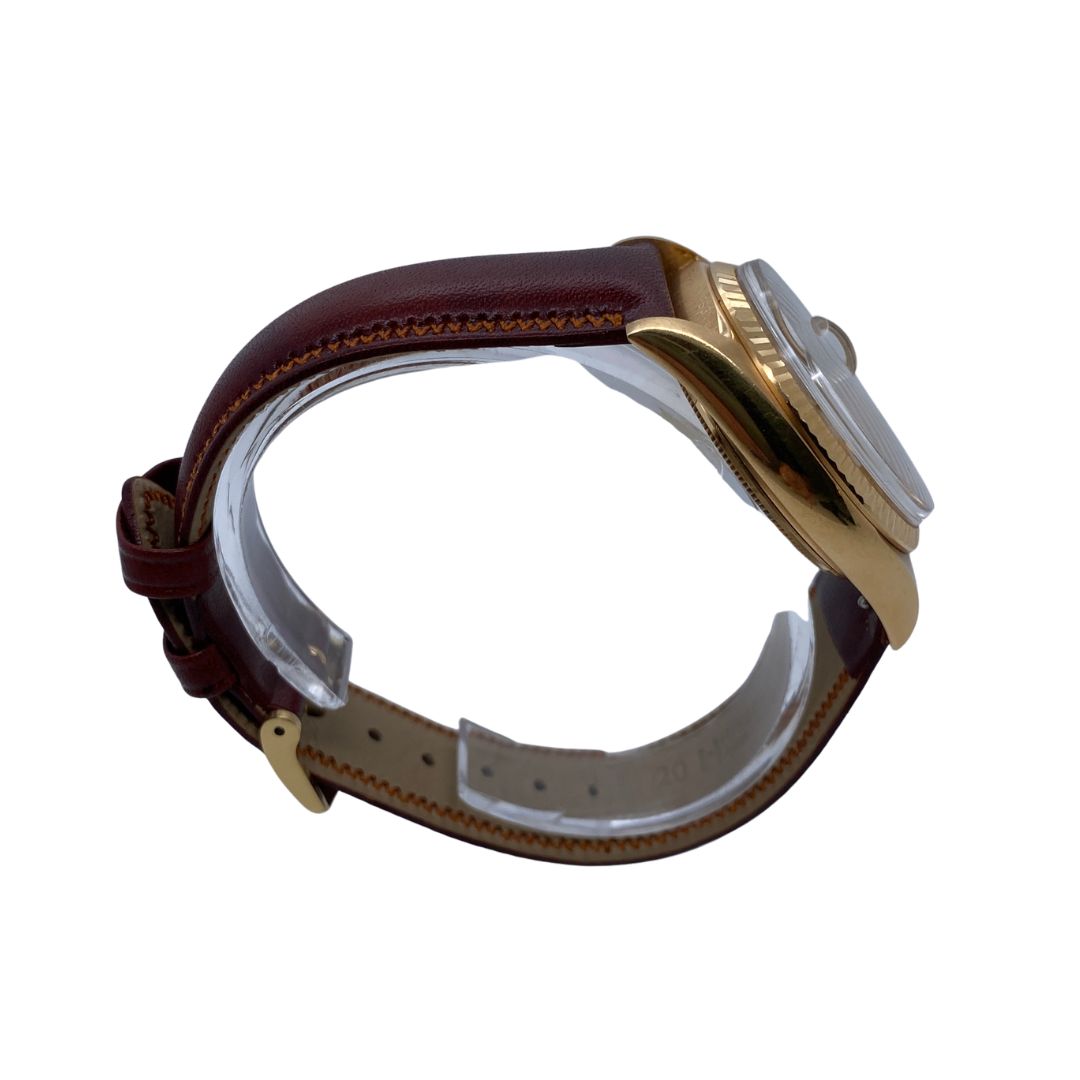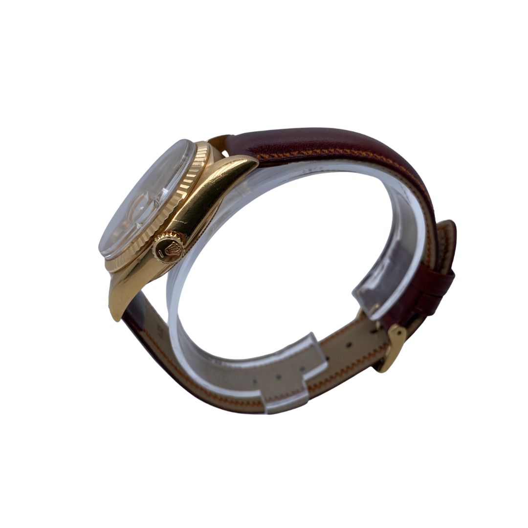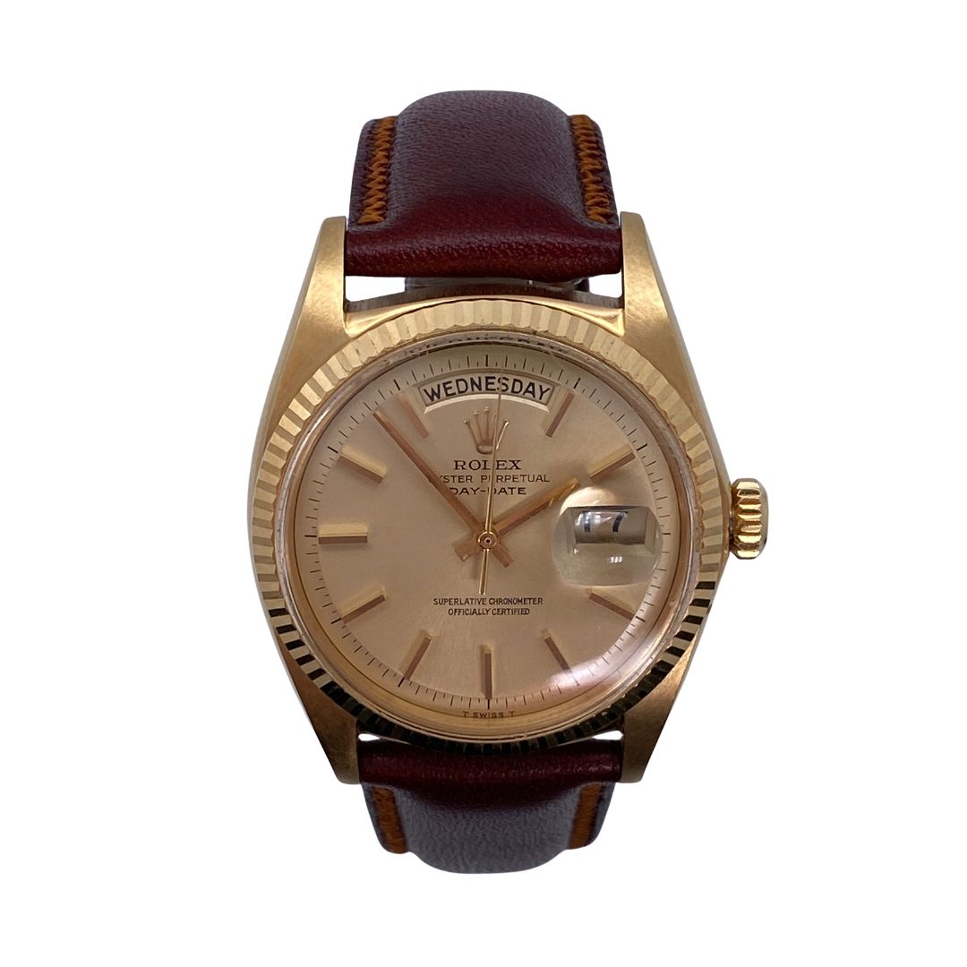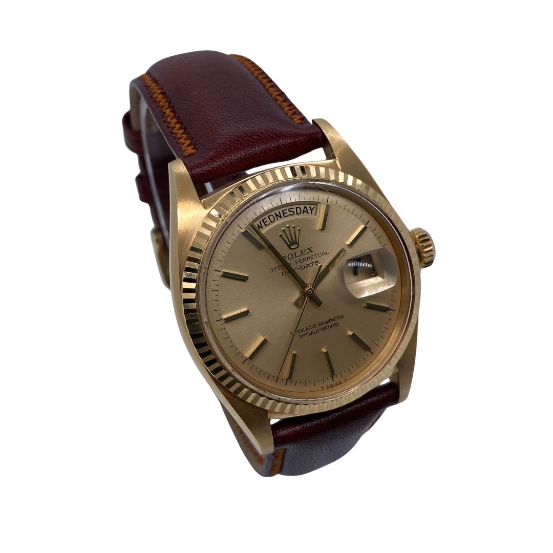 The 1966 Rolex Day‑Date Ref. 1803 is a 36 mm 18‑carat yellow‑gold wristwatch fitted with Rolex’s signature day‑of‑week window at 12 o’clock and a date aperture at 3 o’clock, mounted under an acrylic crystal and framed by a fluted bezel. Dial is non‑luminous (Tritium) champagne.The movement is an automatic chronometer grade caliber 1556, offering robust daily performance and the signature instantaneous date/day change.