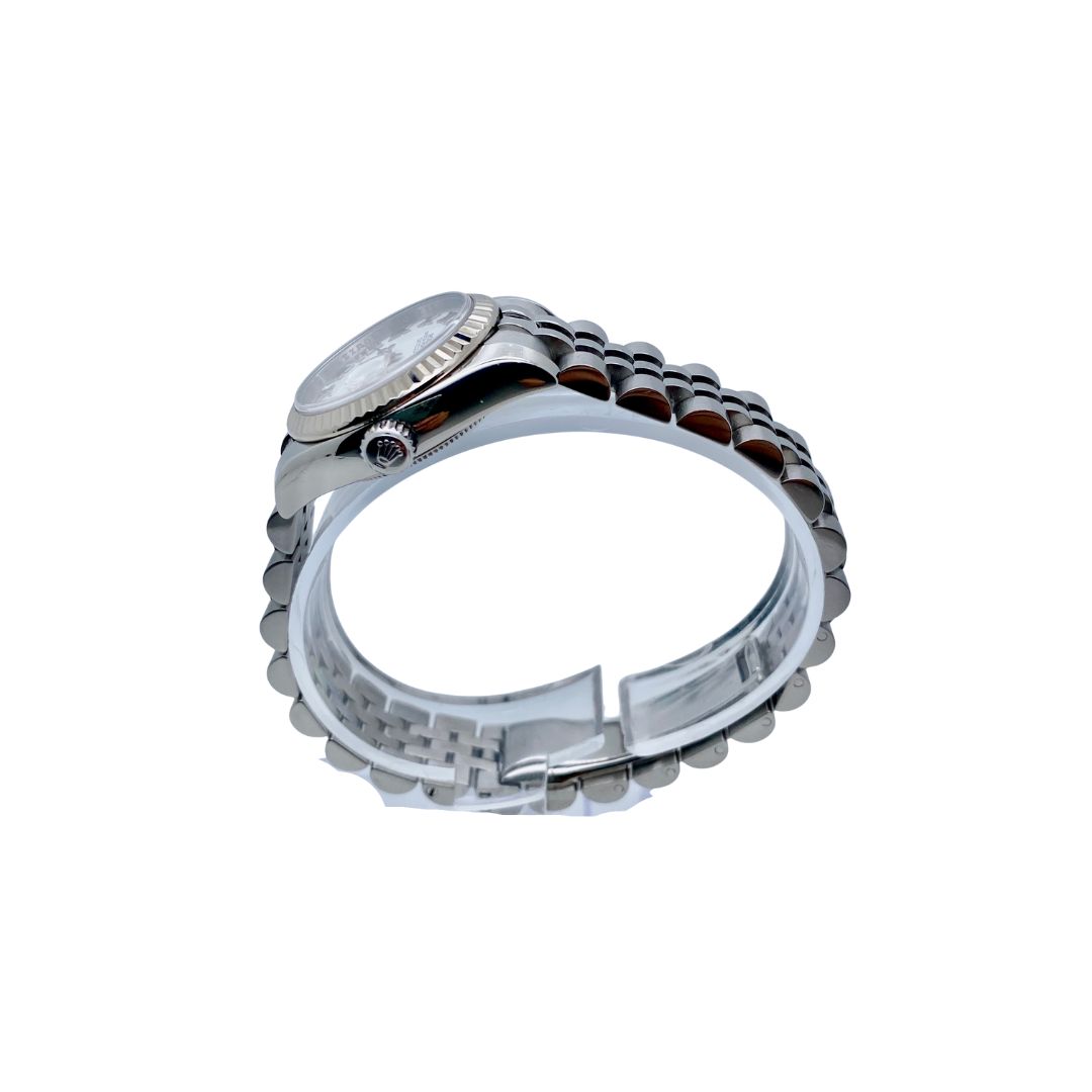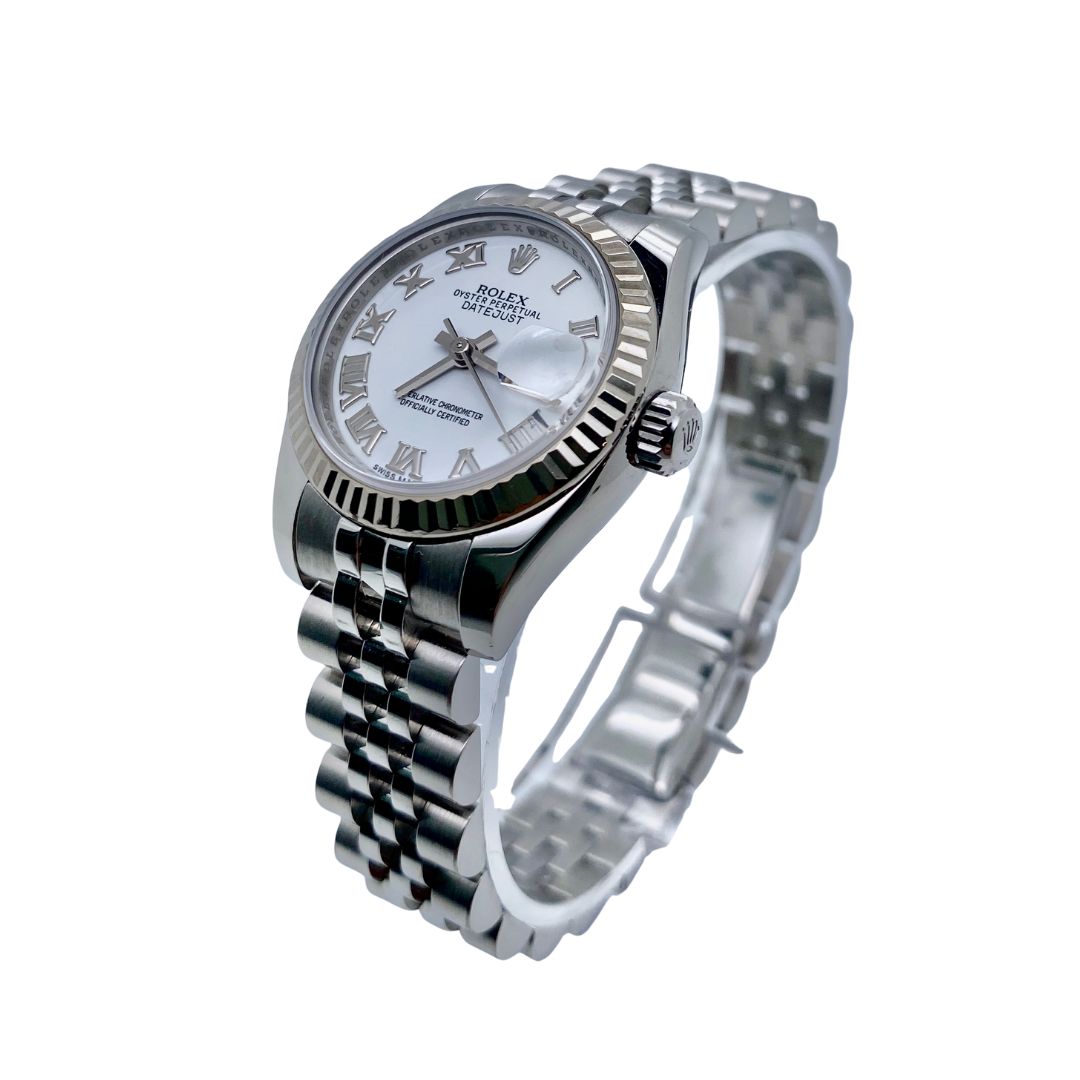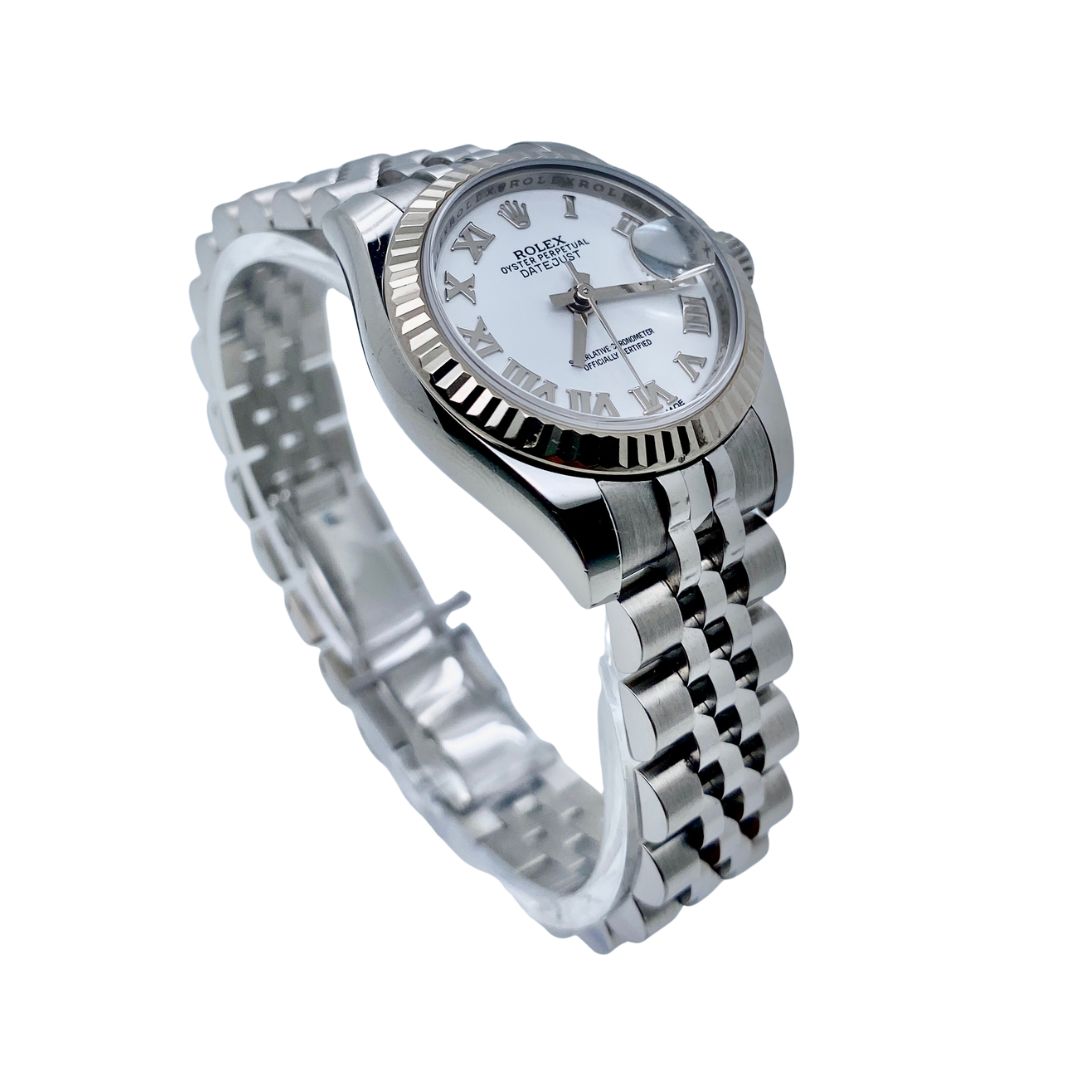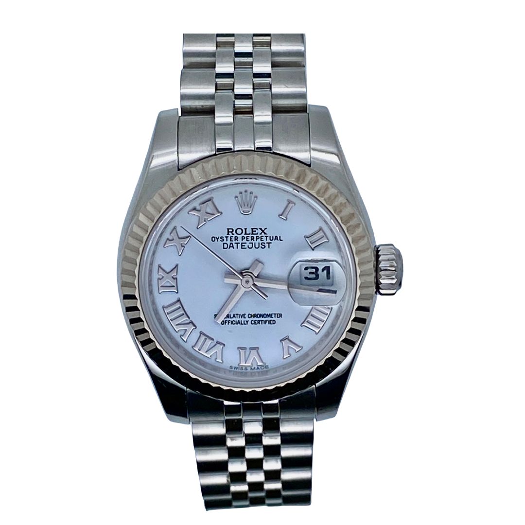 Introduced in 1945, the Rolex Datejust was the first self‑winding wristwatch to feature a date window that automatically changed at midnight — a hallmark innovation that became iconic. Over the decades, the Datejust evolved into countless variations, including the Lady‑Datejust line launched in 1957 to offer the same prestige in a refined, smaller case. The reference 179174 continues this legacy, combining the timeless fluted bezel in white gold with Rolex’s renowned Oyster case and Jubilee bracelet, embodying both tradition and modern elegance.